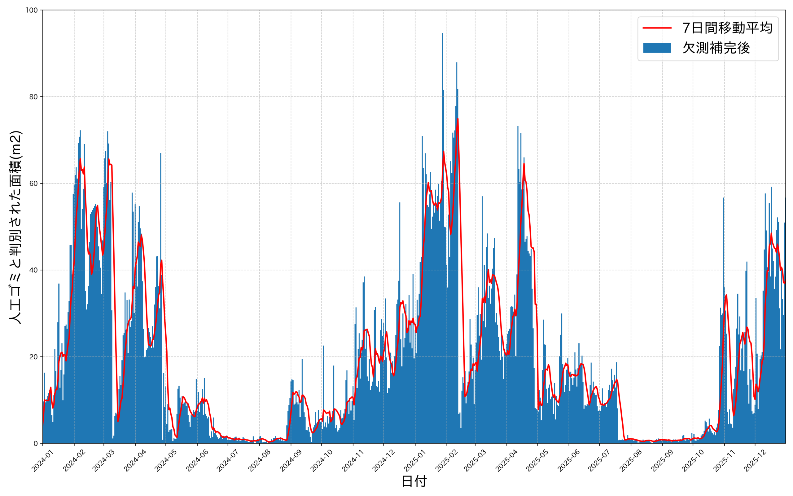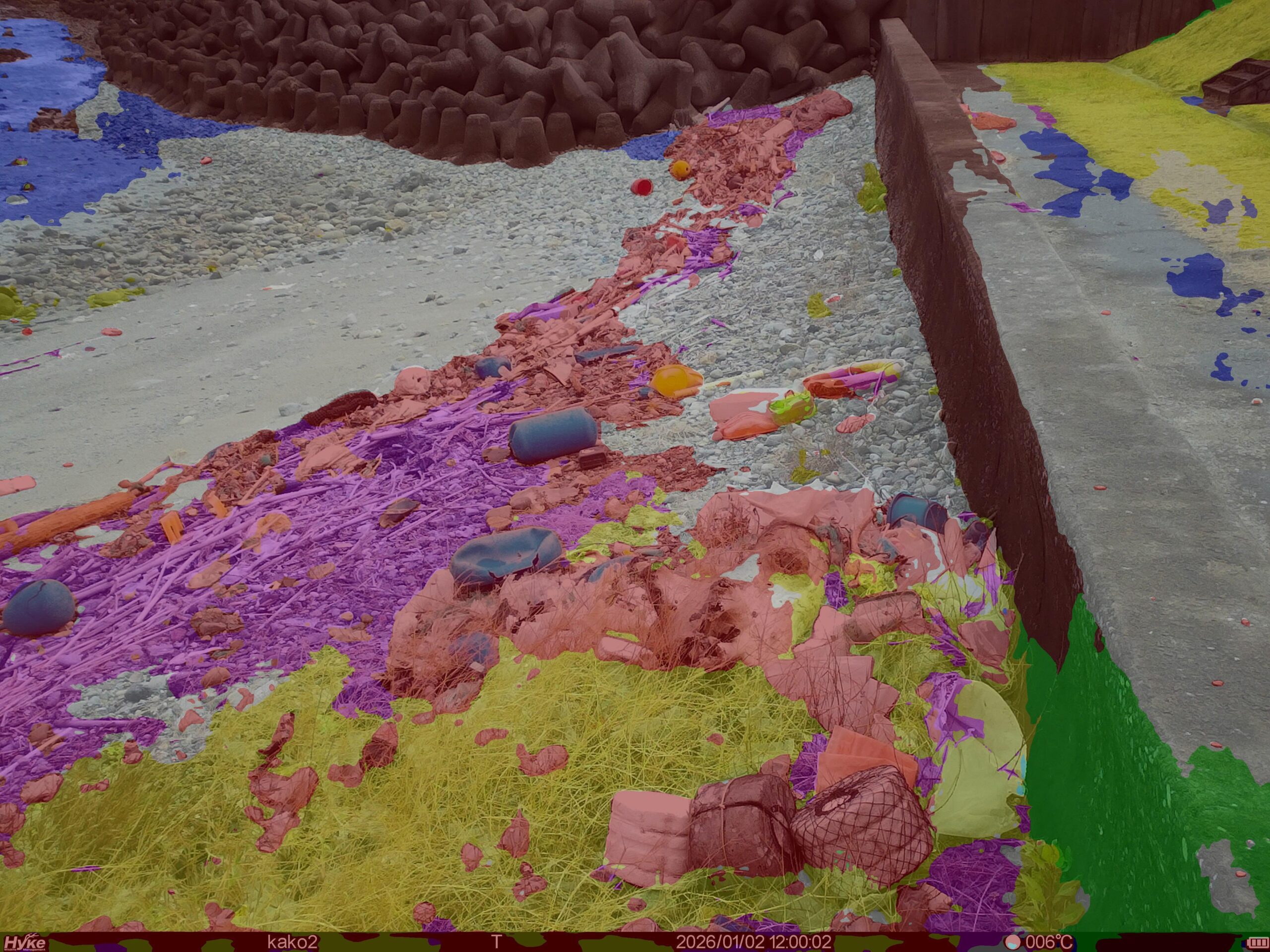 画像解析について 2022/07/08 南さつま市笠沙 我々は、セマンティック・セグメンテーションという深層学習をベースとした画像解析により、Webカメラによって撮影された画像中の対象物を分類しています(Hidaka et al., 2022)。 これをもとにした漂着ごみ量の時系列がコチラ↓ 投稿ナビゲーション 画像解析について »